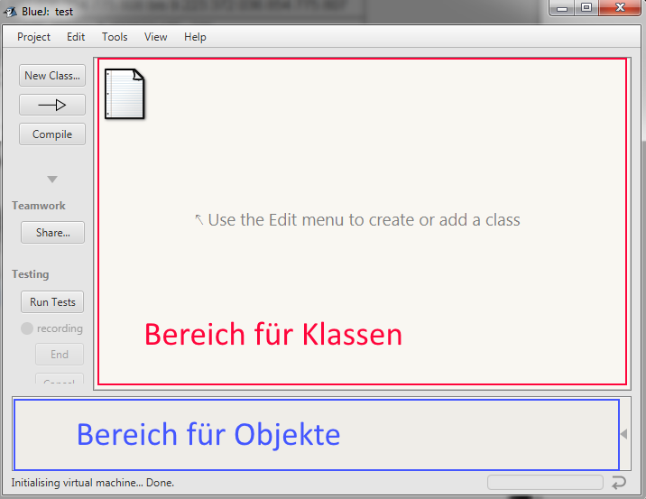 Nach dem Start von BlueJ erscheint eine Aufforderung zur Erstellung eines neuen Projekts. Lege dies auf deinem Stick an. Anschließend sollte folgende Oberfläche erscheinen: