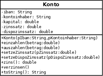 public void zins(). Die Methode zins berechnet die passenden Zinsen. Dabei wird auch darauf geachtet, ob auf dem Konto das Kapital positiv oder negativ ist (Schulden) und dann der passende Zinssatz verwendet. Also bei 1000€ auf dem Konto mit einem Zinssatz von 1% soll es 10€ als Rückgabewert berechnen (\(1000\cdot\frac{1}{100}=10\)). Bei einem negativen Kontostand soll der Dispozinssatz verwendet werden. - Implementiere in der Klasse Konto die Methode
