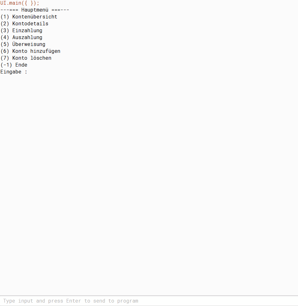 Implementiere eine Klasse UI, welche eine einfache Benutzeroberfläche simuliert. Implementiere mindestens 4 Methoden (wie einzahlen, auszahlen, usw.) und achte dabei auf Fehlermeldungen, zum Beispiel wenn eine IBAN nicht vorhanden ist etc.